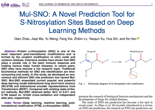 近日,我校计算机与信息工程学院计算机应用技术学科团队成员赵倩副教授为第一作者,硕士研究生马家奇为第二作者,韩轲教授为通讯作者在中科院一区期刊、Top期刊《IEEE Journal of Biomedical and Health Informatics》发表研究论文“Mul-SNO: A novel prediction tool for S- nitrosylation sites based on deep learning methods”(Mul-SNO:一种基于深度学习方法的S-亚硝基化位点的创新预测工具)。论文阐述了蛋白质翻译后修饰在蛋白质的加工、成熟以及改变物理和化学性质中起着非常重要的作用,相关位点的修饰过程可能对其性质和功能产生深远的影响。蛋白质S-亚硝基化(SNO)是最重要的翻译后修饰之一,该位点的正确识别在免疫和神经系统的研究以及阿尔茨海默氏病等药物的开发方面有着重要的意义。本研究基于深度学习方法开发了一套经济、高效的SNO位点预测生物信息工具Mul-SNO。哈尔滨商业大学为该研究成果第一署名单位。本研究工作得到了黑龙江省自然科学基金项目资助。