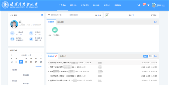 截止到目前,我校网上办事大厅提供电脑端、企业微信端和服务号“哈商大网络中心”3种服务渠道。截止到2021年11月底,网上办事大厅累计为师生提供涵盖13个业务部门的40项服务,办结服务1300+项。