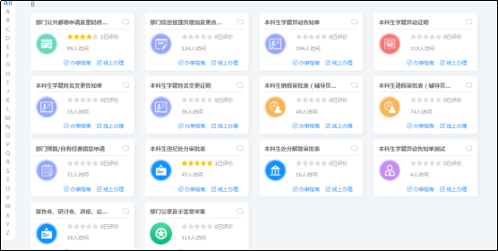 各职能部门在充分调研和征集业务需求的基础上,从与师生学习工作关系紧密的领域和事项做起,对“学籍异动”“ 走读申请”“礼堂使用申请”“讲座申请”“公务用车申请”“在职证明开具”“用印审批”及“OA及邮箱密码重置”等工作进行梳理,优化工作流程,在我校网上办事大厅信息服务平台推出线上办理业务。线上办理业务以“信息多跑路,师生少跑腿”为建设目标,改善了传统线下办事效率低、环节多、跑路难的弊端,提高了我校管理水平和服务满意度,实现了“工作思维信息化,权力运行公开化,办事‘套路’简便化,服务模式人性化”的目标。
