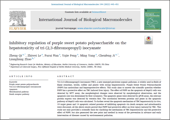 近日,我校药学院(药物工程技术研究中心)綦峥副研究员的研究成果“Inhibitory regulation of purple sweet potato polysaccharide on the hepatotoxicity of tri-(2,3-dibromopropyl) isocyanate”(《紫薯多糖对三(2,3-二溴丙基)异氰酸酯肝毒性的抑制调控策略》)在中科院一区Top期刊《International Journal of Biological Macromolecules》上发表,本研究工作依托于黑龙江省自然科学基金项目资助。哈尔滨商业大学为该研究成果第一作者和第一通讯署名单位,綦峥副研究员、汲晨锋研究员为本文共同通讯作者。
