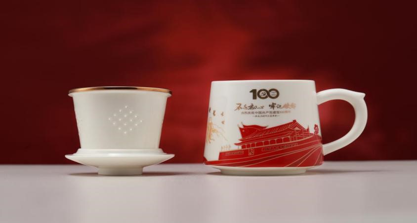 设计制作红色主题艺术作品。学院青年教师刘迪在院党委的指导下,与陶瓷实习基地共同设计制作了一款庆祝中国共产党成立100周年办公茶杯,整体造型仿照中国古代建筑,内部增加茶漏功能,把手灵感源自红山文化玉龙,外观造型简约现代,纹饰配有系列红色文化元素。