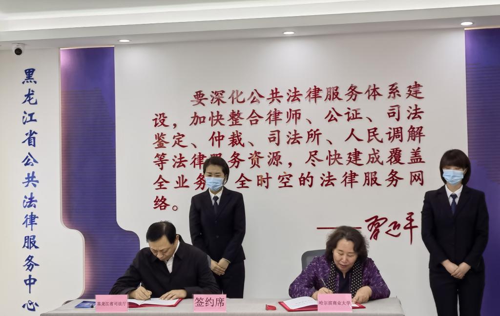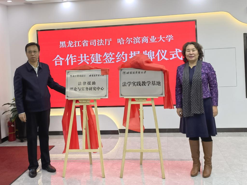 1月11日,为整合和优化配置资源,发挥高校理论研究、人才培养和培训的功能优势,深度参与司法行政机关改革和工作实践,促进公共法律服务体系建设实践与法学理论研究和教育改革紧密结合,推进公共法律服务体系建设的协同创新、高质量发展,黑龙江省司法厅与部分高校共建法学实践基地和研究中心,在黑龙江省公共法律服务中心举行了签约揭牌仪式。黑龙江省司法厅党委书记、厅长崔永洪,司法厅党委委员、副厅长刘勇以及相关高校领导出席签约揭牌仪式。我校校长郑秋鹛,法学院院长石晶玉,法学院副院长石贤平参加签约揭牌仪式和法律援助工作座谈会。校长郑秋鹛代表哈尔滨商业大学与黑龙江省司法厅签约共建法学实践基地和法律援助理论与实务研究中心。