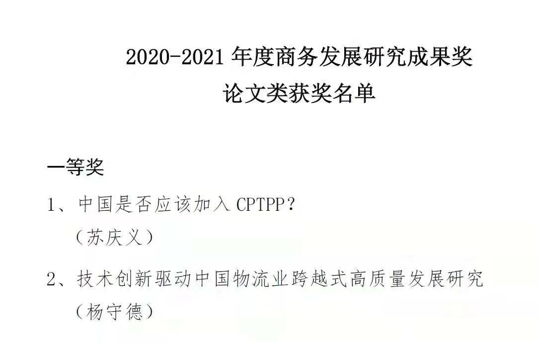 近日,由商务部组织的“商务发展研究成果奖”(2020-2021年度)评选结果揭晓,经济学院杨守德老师的论文《技术创新驱动中国物流业跨越式高质量发展研究》荣获论文类一等奖。此次论文类成果奖共评出一等奖2项、二等奖9项、三等奖15项、优秀奖45项。