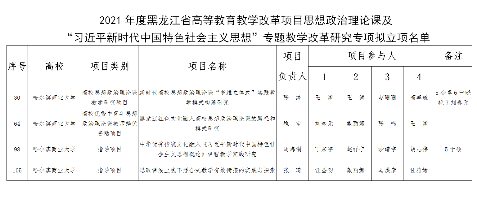 近日,省教育厅公布了《2021年度黑龙江省高等教育教学改革项目思想政治理论课及“习近平新时代中国特色社会主义思想”专题教学改革研究专项立项名单》,哈尔滨商业大学共获得4个项目的立项。其中,张纯老师主持申报的《新时代高校思想政治理论课“多维立体式”实践教学模式构建研究》获得高校思想政治理论课教学研究项目立项;程宝老师主持申报的《黑龙江红色文化融入高校思想政治理论课的路径和模式研究》获得高校优秀中青年思想政治理论课教师择优资助项目立项;周海涓老师主持申报的《中华优秀传统文化融入<习近平新时代中国特色社会主义思想概论>课程教学实践研究》与张琦老师主持申报的《思政课线上线下混合式教学有效衔接的实践与探索》获得指导项目立项。