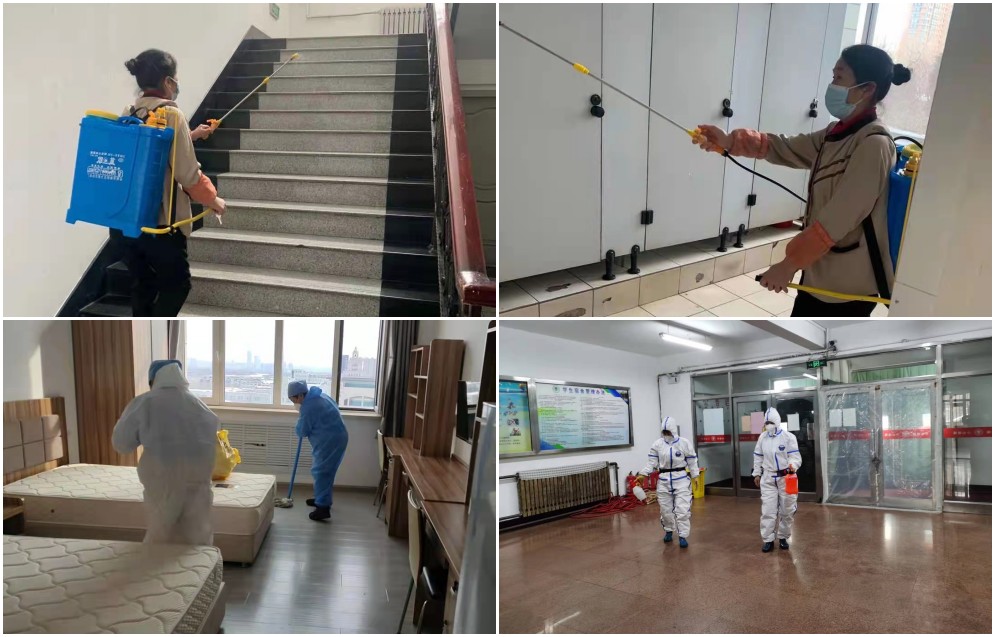 为给师生提供安全便利的公共区域环境,在开展校园内环境卫生整治、消毒杀菌以及日常环境清洁的基础上,对教室、实验室、图书馆、公寓、食堂、隔离室、空调系统等重点区域进行彻底消毒,对公共区域进行预防性消毒、地毯式消杀,完成冰雪清理和垃圾清运。对宿舍及建筑楼宇的走廊、楼梯间、洗漱间、卫生间、开水间、自习间、临时隔离室等区域进行全方位的环境清理和通风消毒工作,做好通风消毒记录,为广大师全力打造安全、卫生、清洁的住宿环境和校园卫生环境。