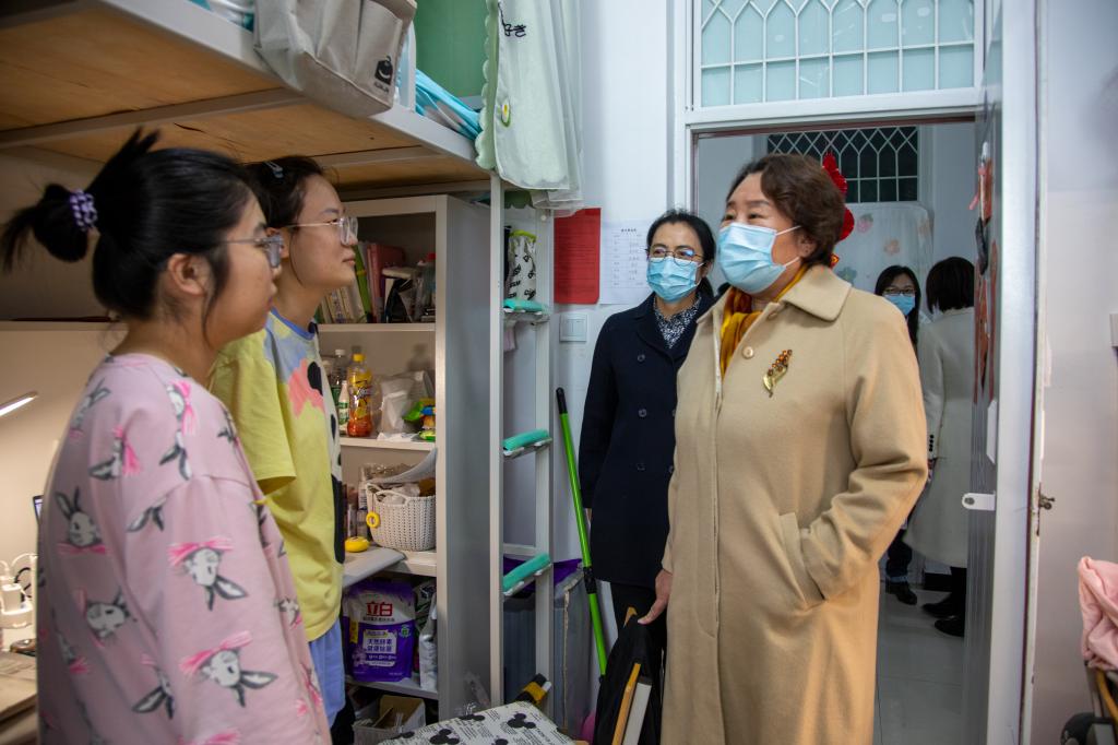 郑秋鹛一行来到学生宿舍、图书馆等地,亲切询问学生线上教学网络保障、教学质量、后勤服务等方面情况以及在学习和生活中遇到的问题与困难等,并与学生进行深入细致的交流。郑秋鹛鼓励同学们要以积极的状态调整好在校期间的学习与生活,保持阳光的心态和健康的生活习惯,加强自我管理,勤奋自律,刻苦学习,确保取得良好的学习效果。