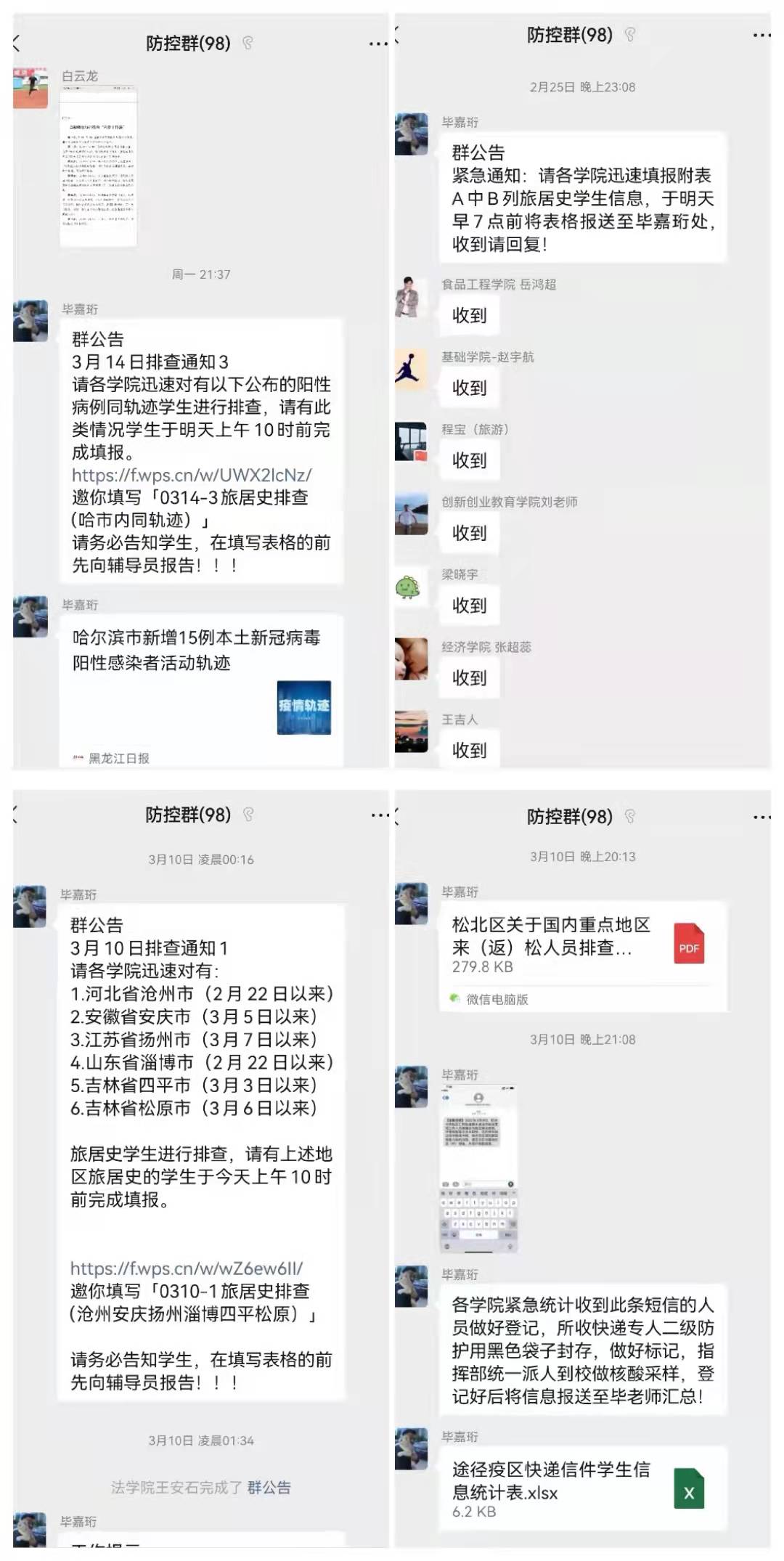 疫情就是命令,防控就是责任。面临疫情防控工作严峻形势,哈尔滨商业大学学生工作队伍认真落实学校疫情防控工作部署,扎实推进学生疫情防控和思想政治教育工作,以实际行动践行立德树人的使命担当,凝心聚力,并肩战“疫”,共筑抵御疫情坚不可摧的“商大防线”。