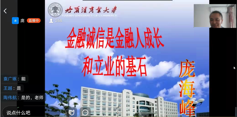 4月2日上午,我校“诚信大讲堂”系列讲座之“金融诚信是金融人成长和立业的基石”在线上顺利举办。本次讲座主讲人为我校金融学院党委投资学专业党支部书记、硕士生导师庞海峰教授。金融学院、经济学院等学院300余名师生通过钉钉平台参加报告会。