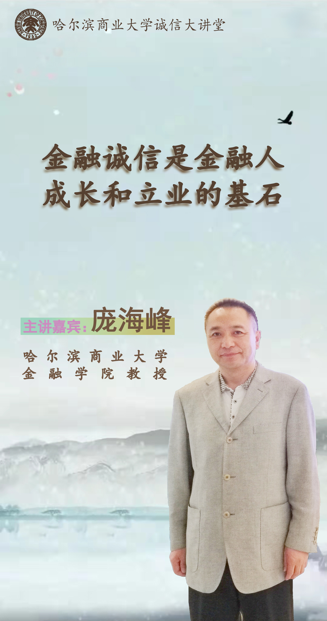 庞海峰教授首先介绍了诚信的起源与内涵,进而指出征信与金融之间共生共荣关系。接着,他通过例举古今正反两个方面的诚信故事和典型案例,强调诚信是立人之本,立业之基,并分析晋商等商帮欣欣向荣,其赖以经营的基础就是基于诚信、团结理念而形成的商帮信用体制,指出诚信是金融人成长、立业的基石,诚信是金融业的灵魂。最后,他还分析了当今大学生在日常行为守时、感情问题、上课和考试、对待金钱的态度等方面诚信缺失的表现,引导大学生树立诚信意识,在今后的学习、生活和工作中与诚信为伴,争做新时代诚实守信青年。