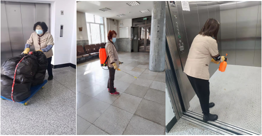 为了给校内2万余名师生提供安全整洁的校园环境,他们坚守防疫一线,严格遵守《应对疫情环境卫生消毒和检查制度》,“公共区域和电梯每天消杀4次,卫生间每2小时消杀1次,84消毒液的配比是1:100,浓度为500mg/L……”他们认真学习消毒培训,一遍又一遍在心里默念,熟悉消毒操作流程,明确消杀、通风标准。消杀工作任务繁重、责任重大,每天早上不到6点,他们就开始室内外的保洁,然后进行公共区域的消杀,地面、门窗、把手、电梯、卫生间……再进行通风,一遍又一遍,重复循环,坚决做到疫情防控无死角。卫生间分区设置保洁工具、为浴室更衣柜设置消毒贴、维修电梯保障师生乘坐方便、设置警戒线减少安全隐患……这些年过半百的叔叔阿姨们,组成抗疫消杀突击队,肩负起防疫消杀的艰巨任务,在保障日常保洁工作的前提下,完成全校公共区域的消杀工作,用平凡的身躯筑起了抗疫的坚实屏障,他们用实际行动对“责任、担当、奉献”做出了最好的诠释。