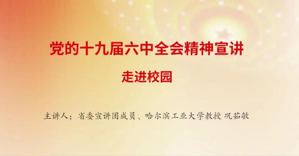 本次宣讲由省委宣讲团成员、哈尔滨工业大学教授巩茹敏担任主讲。报告围绕党的十九届六中全会总体概况、主要内容、鲜明特点等方面,对党的十九届六中全会精神进行了全面系统的阐释和解读;并从知行合一的视角提出了践行党的十九届六中全会精神的思考启示,阐释了当前学习贯彻全会精神的实践要求。
