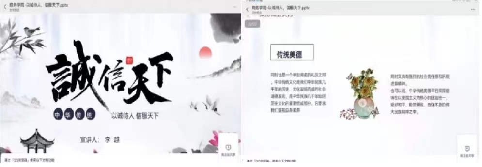 为深入学习贯彻习近平新时代中国特色社会主义思想,积极培育和践行社会主义核心价值观,全面落实立德树人根本任务,发挥诚信文化育人效应,商务学院团委开展诚信主题团日活动,进一步丰富诚信文化建设载体,锤炼学生品德修为,提升诚信文化素养。