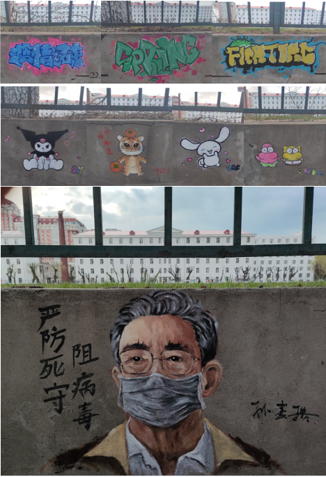 此外,我院学生对在南区操场外墙进行了涂鸦墙绘,墙绘内容表达了学生们对于疫情早日结束的美好期待,也反映出学生们积极乐观的心态,不仅美化了校园环境,也鼓舞了师生们共同抗疫的斗志和热情,成为校园一道独特的风景线。