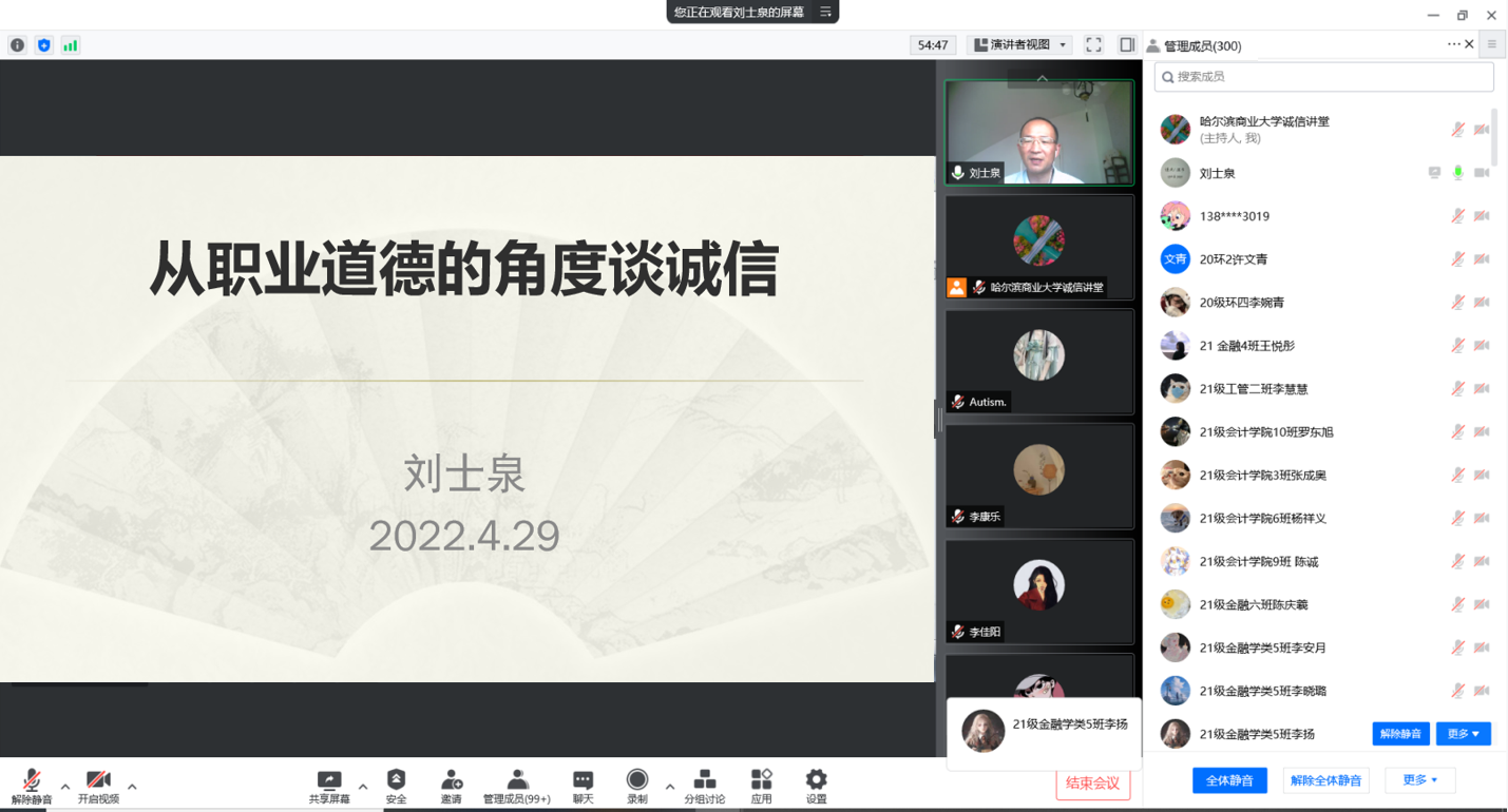 4月29日下午,我校“诚信大讲堂”系列讲座之“从职业道德的角度谈诚信”在线上顺利举办。我校会计学院1993级校友,青岛泉智哈商经济服务有限公司总经理,青岛荣晟管理咨询有限公司联合创始人、总经理,青岛明哒尔会计师事务所合伙人、副所长刘士泉担任本期诚信讲堂主讲嘉宾。会计学院、财政与公共管理学院、金融学院、法学院、设计艺术学院、体育学院、职业技术教育学院等学院300余名师生通过腾讯平台参加报告会。