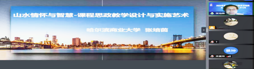 哈尔滨商业大学硕士生导师、省级教学名师张培茵教授作题为《课程思政教学设计与实施途径》专题报告,从对课程思政目标任务的准确理解、不同专业课程思政元素的挖掘、实现课程思政效果的教学过程创新等方面阐述了实践思考,同时分享了具有“山水情怀与智慧”的优秀教师是怎样练成的。