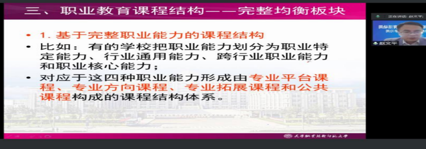 辽宁省职业教育研究院首席专家、沈阳师范大学二级教授徐涵作题为《基于职业能力的职业教育课程建设》专题报告,重点阐述了基于职业能力的课程开发和学业评价。