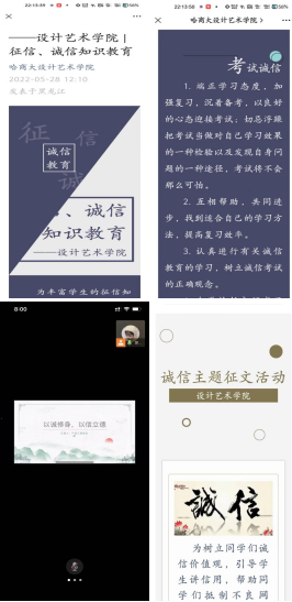 设计艺术学院按照学校资助诚信教育主题活动方案工作部署,结合学院实际,将学生资助工作与诚信文化建设紧密融合,开展“学生资助诚信教育主题活动”。学院充分发挥媒体矩阵宣传引导作用,教育引导学生树立正确的消费观、诚信观,在学院官微发布“征信、诚信知识教育”主题推文,从征信的重要作用、何种行为导致失信、失信的严重后果等三方面,讲解在信用卡还款、贷款偿还方面的注意事项,大大提升了学生们的征信意识,有效降低了不良征信的产生;从理性消费、远离“校园贷”、“套路贷”等方面,深入剖析不良贷款的害人之深,提升了学生抵御诱惑的能力,培养学生正确科学的消费观念;结合学习方法、考场纪律、作弊后果等方面,教育同学们养成良好的学习习惯,掌握科学的学习方法,不碰考场纪律红线,不越考试诚信的底线,增强学生自觉遵守考试纪律的意识。学院各班级开展“以诚修身,以信立德”主题团课,深入宣传征信意识、金融安全防范知识,团课过程中同学们认真聆听,积极讨论,同学们一致表示,要以诚信为荣,以失信为耻,争做诚实守信的文明大学生。学院积极搭建创作平台,广收诚信美文,利用官方平台征集诚信美文,同学们从画纸转战到稿纸,用文字代替画笔,描述着自己心中的诚信之美、诚信力量。