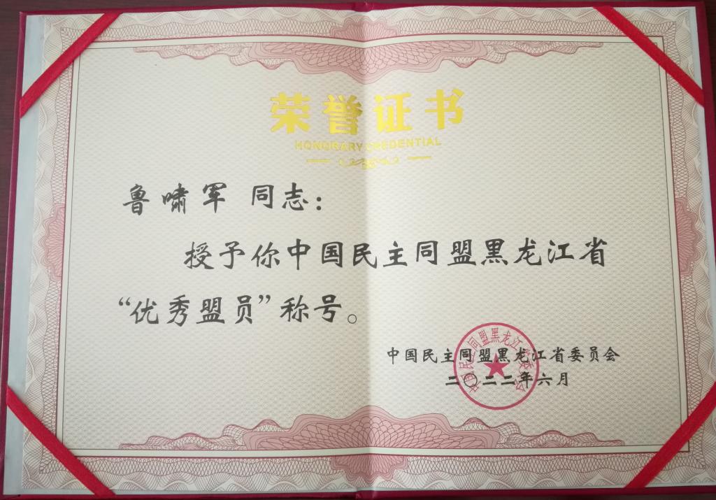 我校民盟支部原主委卢翠莲同志参加了本次大会,现任主委鲁啸军被评为“优秀盟员”,我校民盟支部被民盟省委授予“先进基层组织”荣誉称号,鲁啸军当选为民盟黑龙江省第十三届委员会委员。