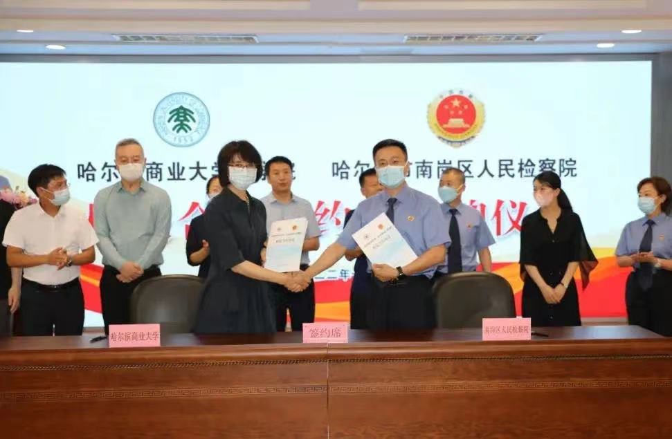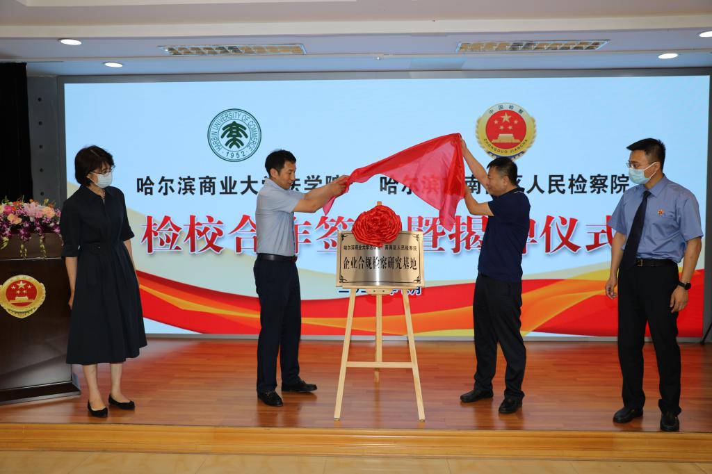 为切实发挥法治实务部门在法治人才培养中的作用,进一步推动检察机关与高校深度融合,推动校检资源共享、优势互补、共建共赢,携手提高优化营商环境的社会服务能力,7月21日,我校法学院与南岗区人民检察院举行检校合作签约暨“企业合规检察研究基地”揭牌仪式。哈尔滨市人民检察院副检察长徐晓光、南岗区人民检察院检察长洪海,我校副校长李景义、法学院院长石晶玉、法学院党委副书记李萍、法学院副院长石贤平,南岗区人民检察院相关干警及我校法学院教师代表参加签约揭牌仪式。