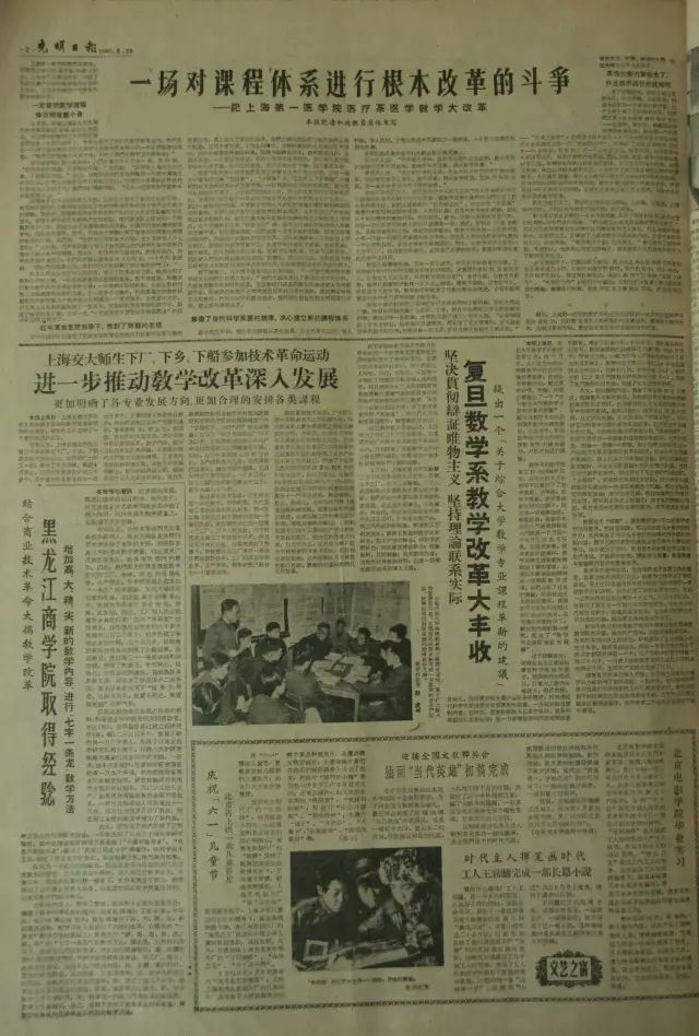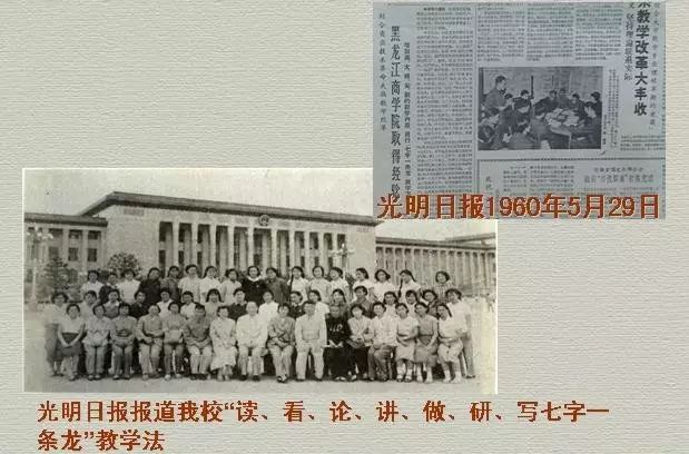 翻开1960年5月29日的《光明日报》,报纸版面的左侧刊登着《结合商业技术革命大搞教学改革 黑龙江商学院取得经验 增加高、大、精、尖、新的教学内容 进行“七字一条龙”教学方法》一文,详细报道了我校提出的“七字一条龙”教学法。