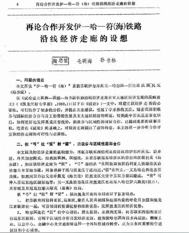 几年来,围绕山地开发的社会调查,他的视野更加开阔、目光更加敏锐,他先是在1986年提出“一个山地开发模式的构想——关于建立绥芬河流域经济区的建设”(后发表在《黑龙江财专学报》1987年第1期);在此基础上,他带领课题组开始了工程浩大的“建设滨州—绥滨—海参崴铁路沿线走廊”“合作开发远东大‘三角’(海参崴—伯力—齐齐哈尔)”“建立山区经济特征”等系列课题研究,后又根据改革开放的形势,于1978年提出“东北亚经济圈开发”的创见,并付诸研究。正当他的研究进行得如火如荼的时候,陶忠信教授却积劳成疾,因心脏病突发于1990年初去世,留下了不尽的遗憾,但是他宝贵的精神遗产至今闪烁着光辉。
