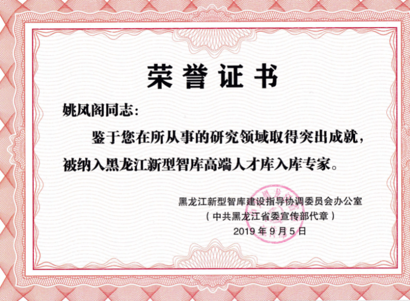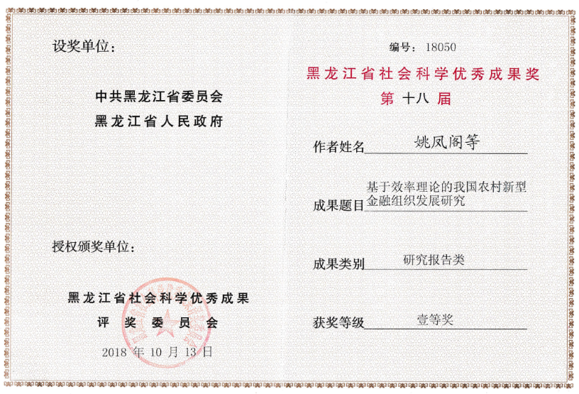 学院院长姚凤阁教授为黑龙江省级金融学科领军人才梯队金融学科带头人。同时金融学院也是黑龙江省金融工程学会会长单位。黑龙江省金融工程学会于2016年9月经黑龙江省民政厅批准成立,由省内金融工程研究领域的学者、专家组成理事会,由姚凤阁教授担任会长,挂靠哈尔滨商业大学,属于全省性金融工程培训与学术研究机构。