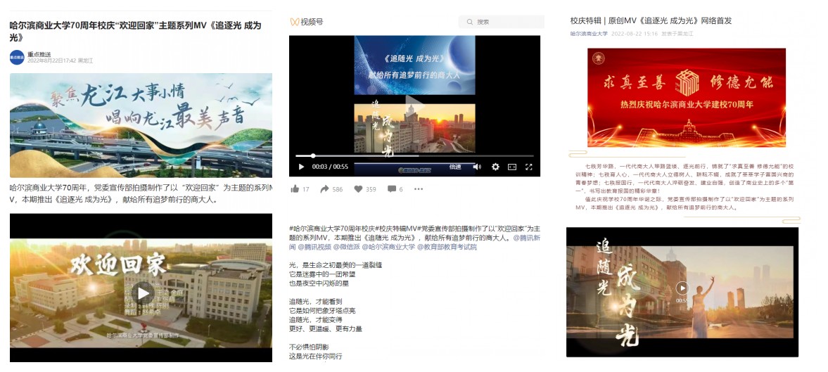 “追随光,成为光”最近成为哈商大校园里师生们常说的一句话,这是由我校党委宣传部制作推出的“欢迎回家”校庆系列主题MV里的一句台词,微视频一经推出就得到了在校师生、校友的广泛关注,视频首发当日点击量超过2万次,腾讯新闻客户端、龙事影响力视频号等媒体纷纷转载,全媒体“云”互动助力哈尔滨商业大学建校70周年校庆,氛围感拉满。