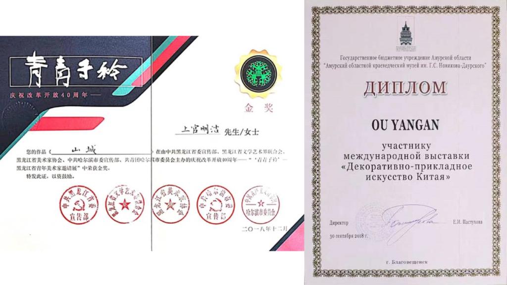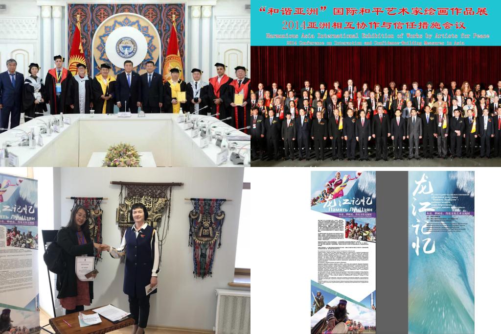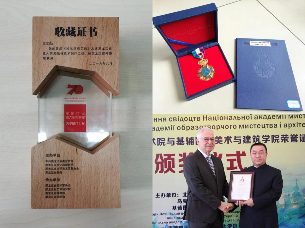 2012年12月,院长王宝成在金边参加“和平之旅—东南亚之行”并荣获柬埔寨王国皇家功勋艺术家证书。2019年10月,乌克兰国家博物馆馆长为王宝成颁发收藏证书,王宝成的作品《路无止境》被乌克兰国家博物馆收藏。2015年3月,王宝成在布鲁塞尔参加“纪念世界反法西斯战争胜利70周年国际和平艺术家作品展”获金画笔奖。2018年6月,王宝成在比什凯克获吉尔吉斯斯坦共和国政府“最佳文艺工作者”的荣誉称号,受到热恩别科夫总统接见。2014年,王宝成参加“和谐亚洲”国际和平艺术家作品展。2013年,王宝成参加上海合作组织-北京峰会“和平之旅”十周年美术作品展,在北京人民大会堂受到原国务院副总理刘延东接见。2018年,欧阳安老师携作品受邀赴俄罗斯阿穆尔州博物馆参加“龙江记忆”黑龙江渔猎民族三皮文化交流展。2018年,欧阳安老师参加“龙江记忆”黑龙江渔猎民族三皮文化交流展图及海报图。