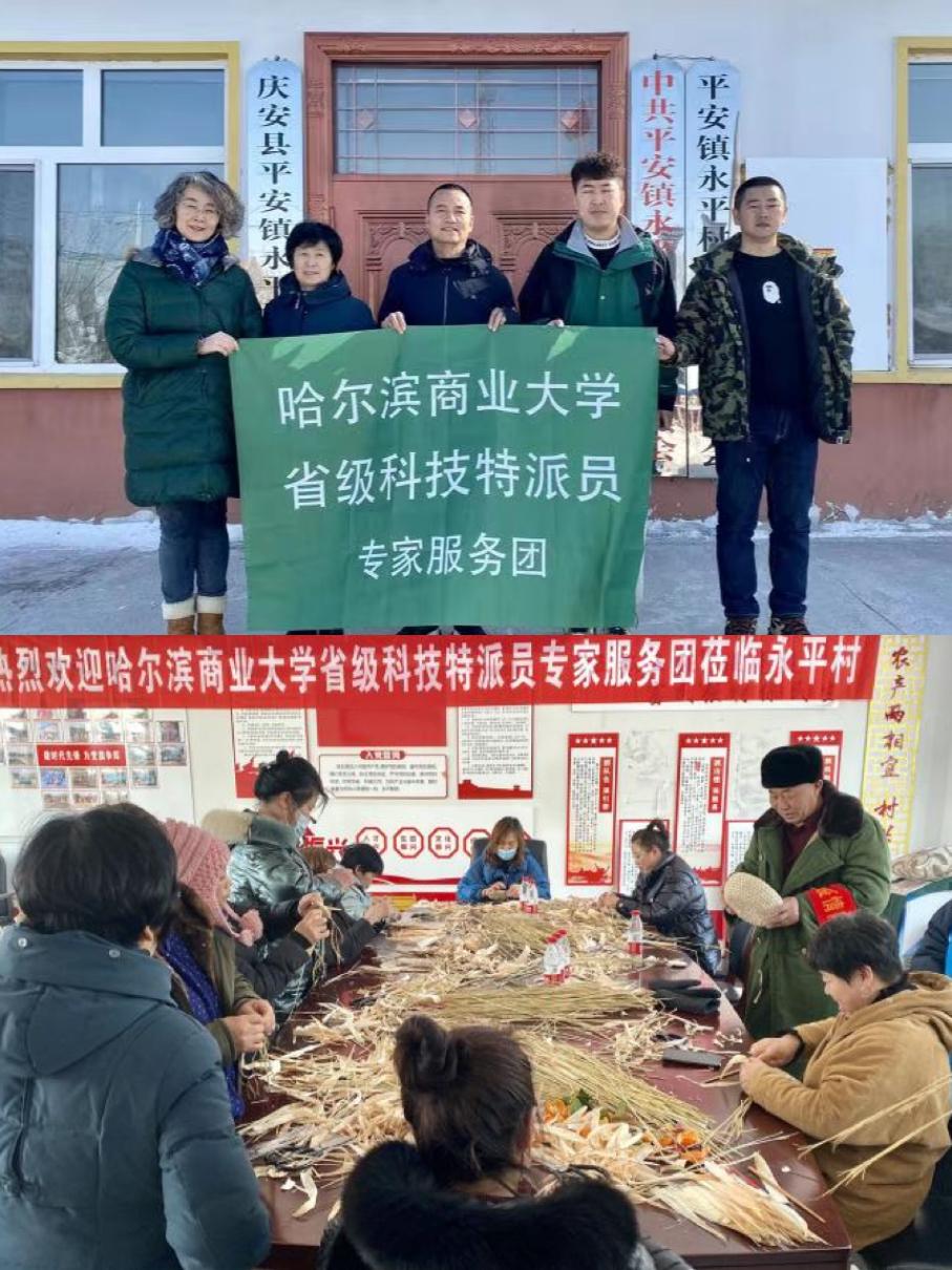 2022年2月,学院教师作为省级科技特派员到绥化市庆安县开展科技服务,欧阳安老师聘请我省著名草编工艺传承人“吕翠杰老师”,一同来到平安镇永平村为当地中老年乡村女学员进行了草编讲座和培训。此次培训的成果不但有利于创建“一村一品”把永平村打造成草编特色村,还为该村提供了哈商大专家团队和大学生双创团队的平台支持,指导帮助永平村利用短视频、自媒体等互联网方式帮助永平村传播草编文化建设成果,增加永平村的“艺术乡村建设”文化影响力。