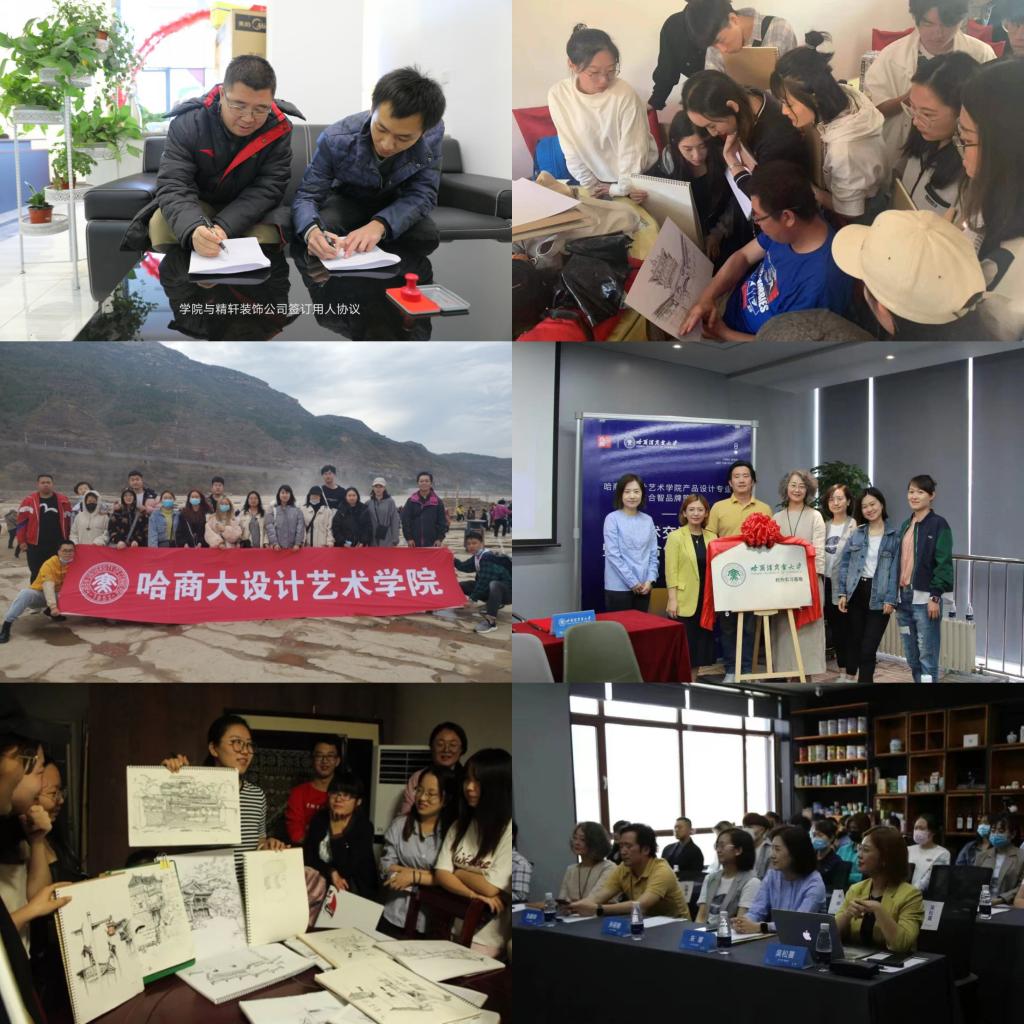 2018年,设计艺术学院在“学易车”公司建立“双创基地”。2017年,设计艺术学院联合深圳桂联控股有限公司开展校企合作,开展商标设计与评奖活动。2018年6月,学院与中国少数民族用品协会签订蜡染实习基地签约仪式,与精轩装饰公司签订用人协议。2014年,学院建立山西省平遥县考察实践基地,学院老师带领学生赴山西省平遥县考察实践基地。2014年,学院在安徽省黟县宏村镇新华建立写生基地,基地年接待写生学生约130人,艺术设计专业学生进行建筑风景写生旨在提高学生的视觉观察能力和艺术鉴赏能力。2021年5月,哈尔滨商业大学设计艺术学院产品设计教研室与哈尔滨合智品牌策划设计有限公司学术交流暨校企合作实践基地签约,并举行揭牌仪式。2018年7月,“黑龙江工业设计产业技术创新战略联盟”成立,该同盟是由黑龙江省科技厅组织成立,学院产品设计教研室主任欧阳安老师任该联盟副秘书长一职。自2016年起,学院环境设计专业与飞腾装饰公司签订实习实训合同,与该实习基地开展了多方面的业务合作,定期邀请企业专家进校指导,派送学生进入公司实习,并择优聘用优秀毕业生就业,在环境设计专业实践教学中,该实习基地发挥了重要的作用,协助我校环境设计专业培养了诸多优秀专业人才。