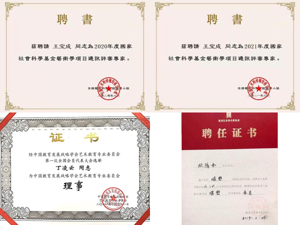 王宝成,中国美术家协会会员、哈尔滨民进开明书画院院长、黑龙江省美术家协会油画艺术委员会副主任,自2020年到2021年连续两年,被全国艺术科学规划领导小组聘请为国家社会科学基金艺术学项目评审专家。丁凌云,黑龙江省美术家协会会员、黑龙江省设计协会会员,2019年任中国教育发展战略会艺术教育委员会理事。尚震,现为中国包装联合会设计委员会委员。欧阳安,2019年被聘为黑龙省美术家协会雕塑艺术委员会委员。倪鑫,黑龙江美术家协会会员、黑龙江省美协环境设计艺委会委员、黑龙江省室内设计学会会员、2015年被聘为黑龙江室内设计学会委员。李建淼,民盟中央美术院黑龙江分院理事、2017年被聘为黑龙省美术家协会水彩艺术委员会委员。