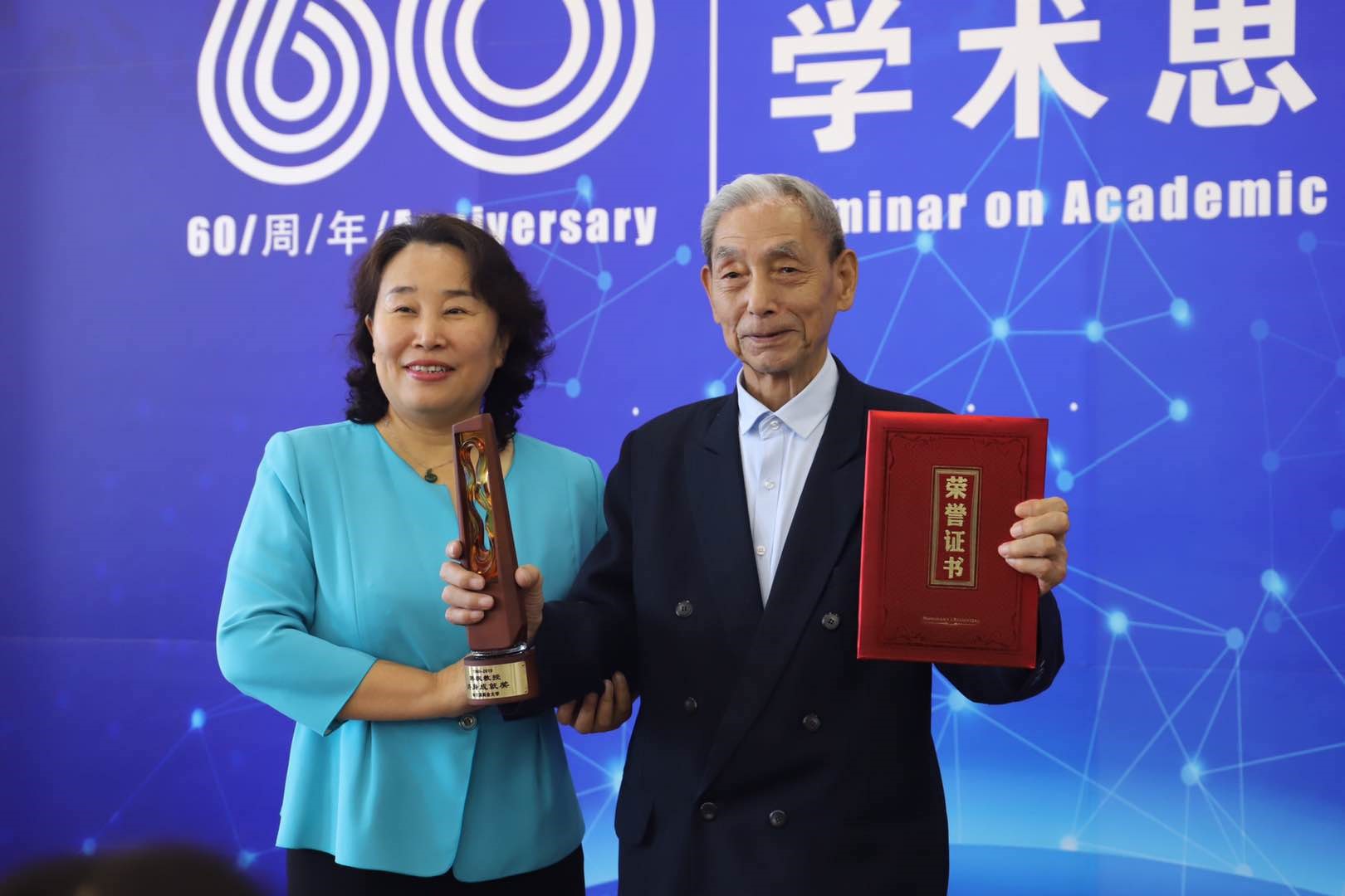 校长郑秋鹛为韩枫教授颁发哈尔滨商业大学终身成就荣誉证书和奖杯