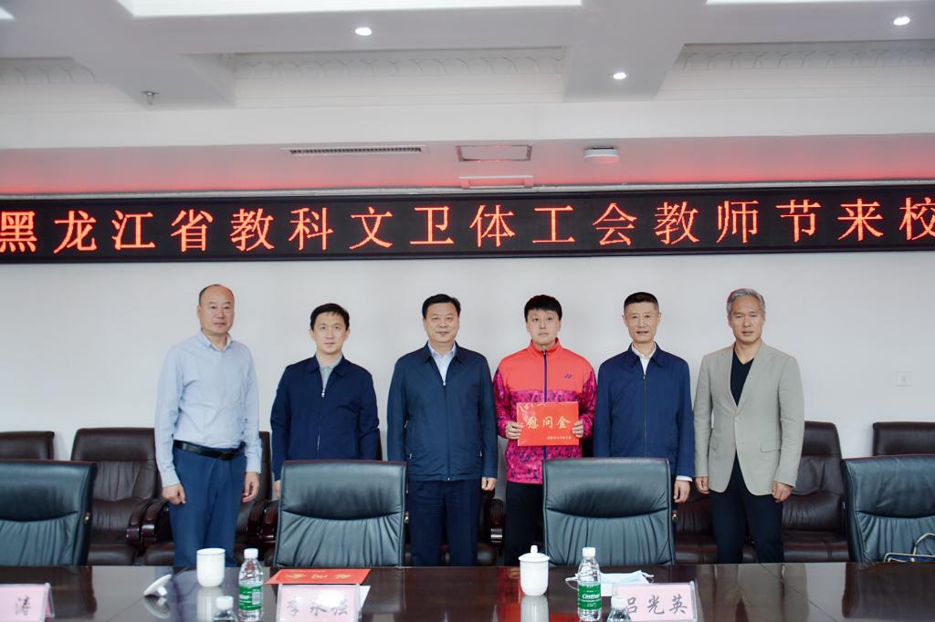 在第38个教师节来临之际,9月8日上午,省总工会党组成员、省教科文卫体工会主席吕光英,省教科文卫体工会副主席李永强,省教科文卫体工会干事李偲一行到我校慰问教师,向我校教师送上真挚的节日祝福,为生活困难教职工送去关心与关怀。我校党委副书记田成义,校工会常务副主席周洪武、体育学院院长唐宝盛、体育学院教师张海志等参加慰问座谈会。