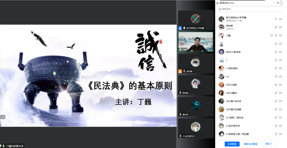 10月20日下午,我校“诚信大讲堂”系列讲座之“诚信:《民法典》的基本原则”在线上顺利举办。本次讲座主讲人为我校法学院教师、硕士研究生导师丁巍。金融学院、法学院、管理学院、经济学院、财政与公共管理学院近300名师生通过线上参加报告会。