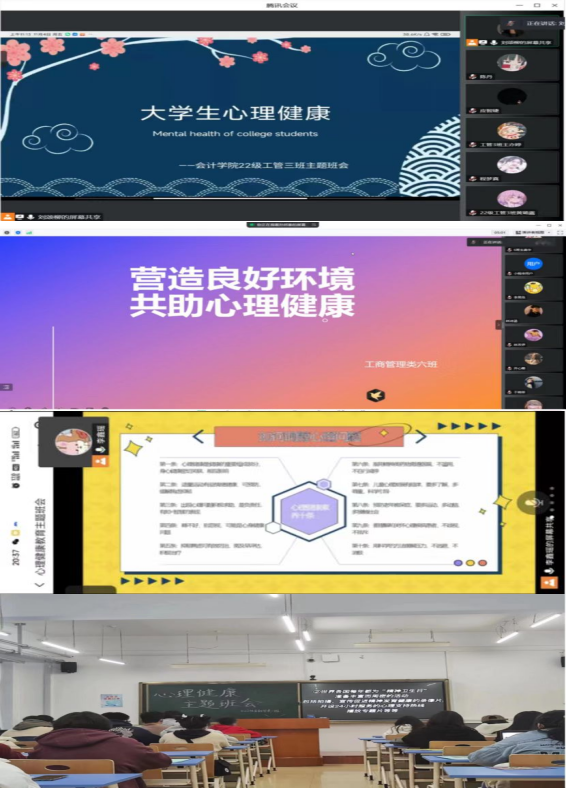 组织开展主题班会活动。为进一步提高学生心理健康水平,促进学生自我成长,各学院以“营造良好环境,共助心理健康”为主题开展主题班会,会计学院、金融学院、商务学院、管理学院等学院从学生实际需求出发,采用线上线下相结合的方式,重点向学生讲解了心理问题出现后的自我调适方法与技巧,帮助学生正确对待心理问题,提升学生积极面对生活与学习的能力。