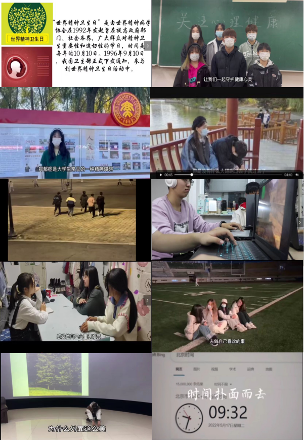 制作世界精神卫生日宣传视频。为进一步帮助学生了解心理危机出现的信号、可能引发的系列问题以及求助途径,打造和谐健康的良好学习生活环境,各学院积极制作心理健康主题宣传视频。法学院、经济学院和管理学院从介绍世界精神卫生日来源、目的、意义、发展以及情绪宣泄与心理调适技巧等角度拍摄视频;财政与公共管理学院、基础科学学院、金融学院、旅游烹饪学院、计算机与信息工程学院、商务学院和外语学院以学生汇演、故事短片的形式制作宣传视频,帮助学生正确评价自我、悦纳自我,提高学生对自身心理健康状况的觉察,引导学生在遇到问题后积极自助、及时求助。