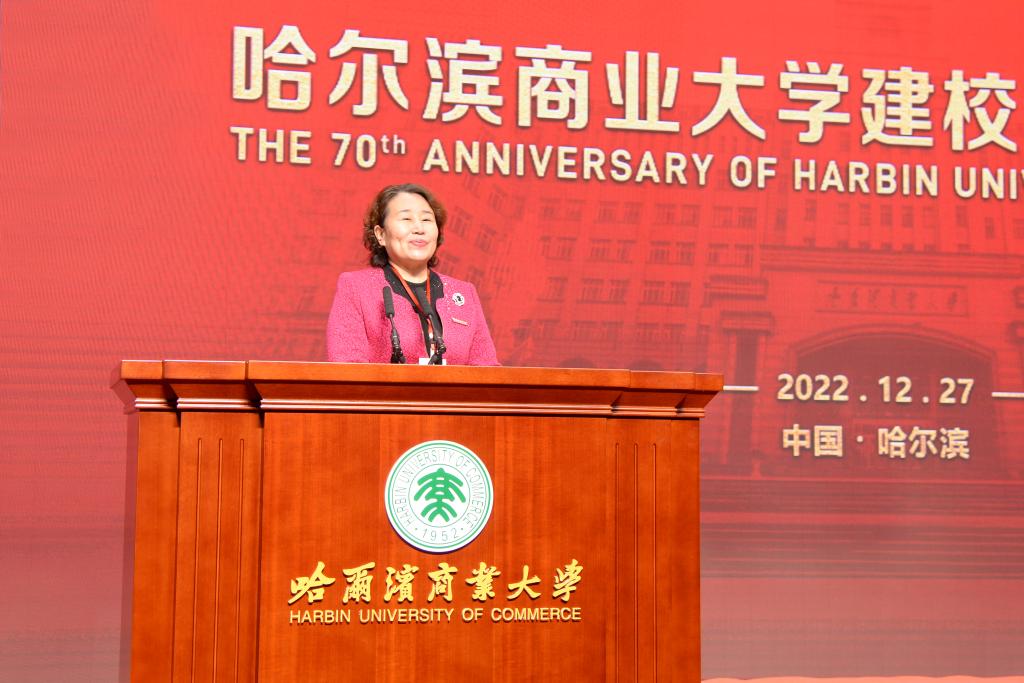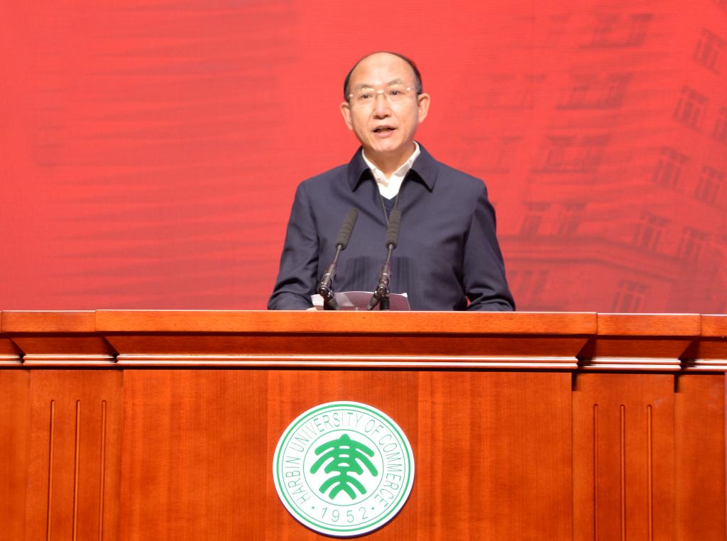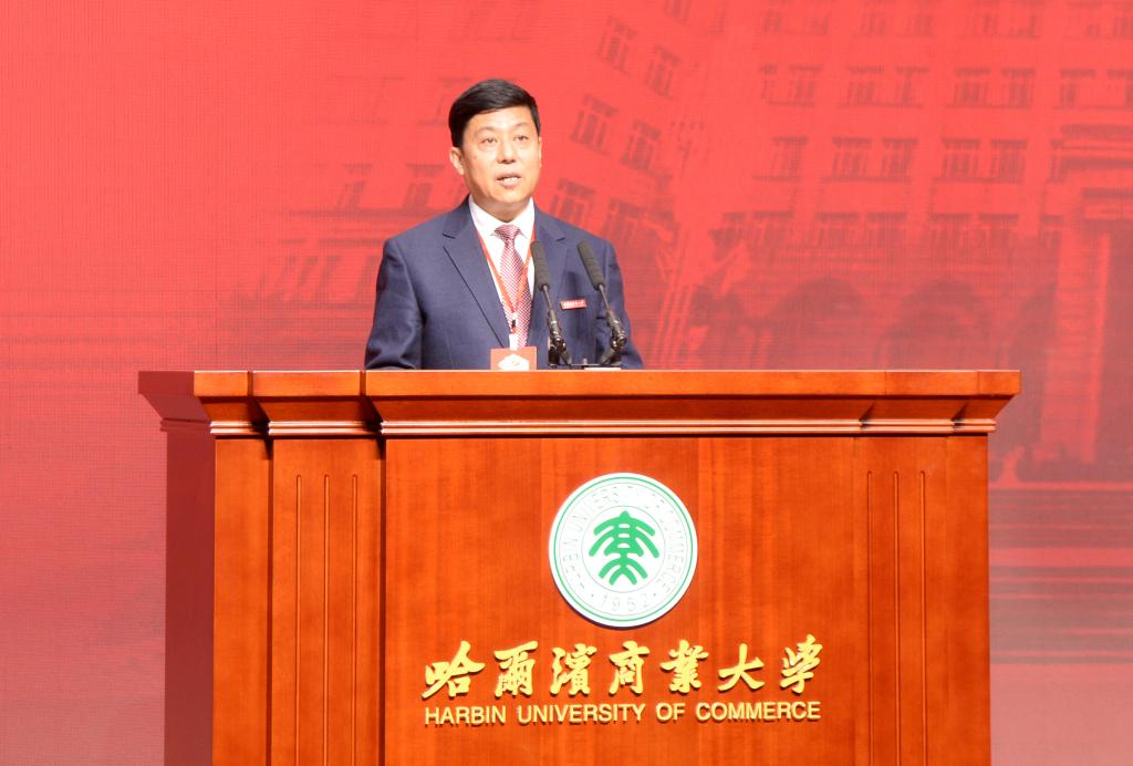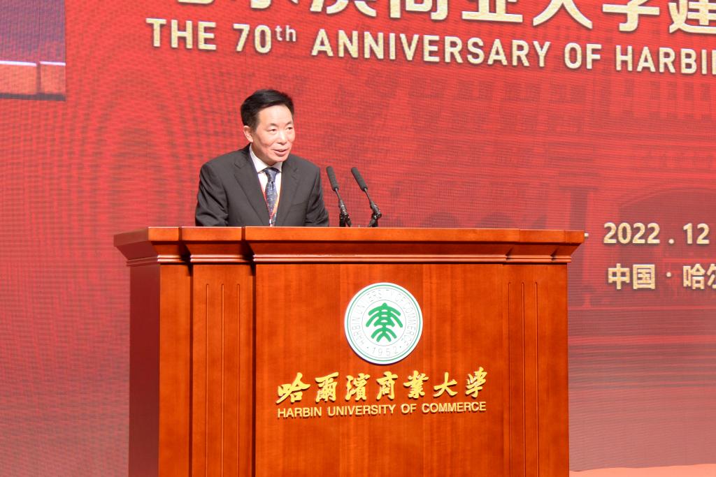 黑龙江省教育厅二级巡视员丁哲学宣读省委、省政府贺信。贺信指出,哈尔滨商业大学建校70年来,始终坚持为党育人、为国育才的初心使命,全面贯彻落实党的教育方针,坚持社会主义办学方向,秉承“求真至善 修德允能”的校训精神,扎根龙江大地,深耕商科沃土,用诚信文化育人、用红色文化铸魂,大力推动学科交叉发展,形成了经管法融合、商工结合的办学格局,为黑龙江商业发展和经济振兴提供了重要的人才和智力支撑,为国家教育事业进步和经济社会发展作出了积极贡献。站在新起点,希望哈尔滨商业大学坚持以习近平新时代中国特色社会主义思想为指导,深刻领悟“两个确立”的决定性意义,不断增强“四个意识”、坚定“四个自信”、做到“两个维护”,聚力内涵建设,加快创新发展,深度服务国家战略和龙江发展需要,积极投身“六个龙江”建设和“八个振兴”实践,努力建成商科特色鲜明的、高水平的多科性教学研究型大学,培养更多可堪大用、能担重任的时代新人,更好服务龙江全面振兴全方位振兴,为实现中华民族伟大复兴的中国梦作出新的更大贡献。