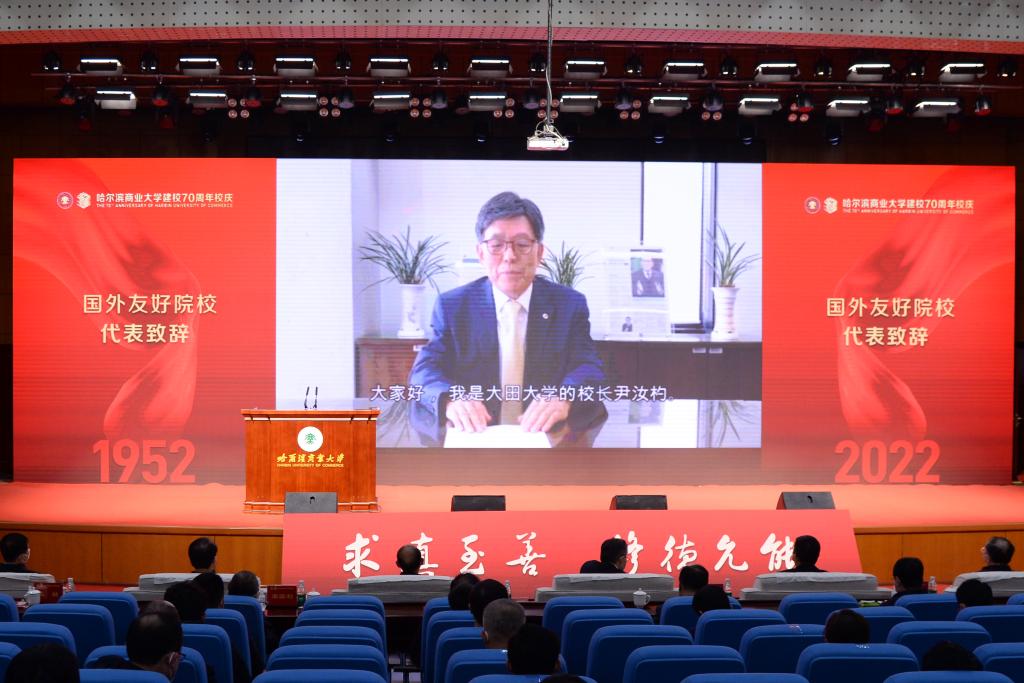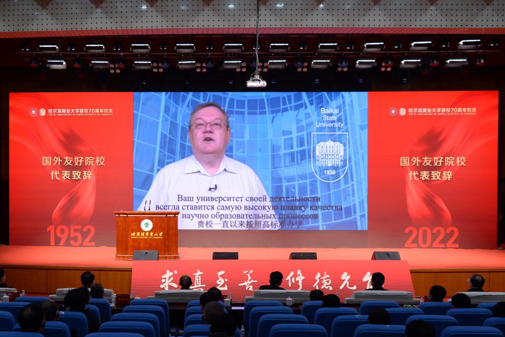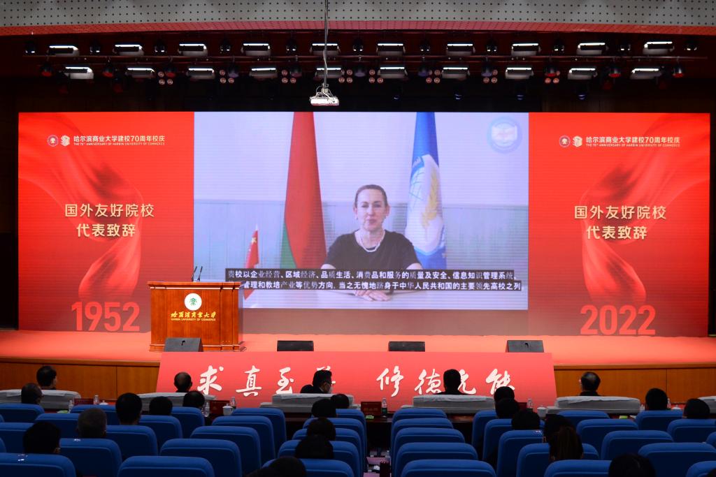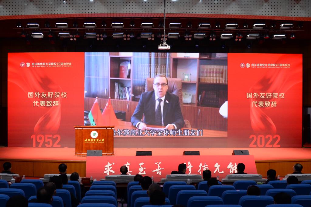 国外友好院校代表、俄罗斯贝加尔国立大学校长伊格纳坚科•维克多•瓦西里耶维奇,白俄罗斯明斯克国立语言大学代理校长、科研工作副校长拉丽萨•塔拉谢维奇,白俄罗斯国立经济大学校长、白俄罗斯立法委员会副主席叶戈罗夫•阿列克谢,韩国大田大学校长尹汝杓分别通过视频致辞,表达对哈尔滨商业大学70华诞的美好祝福。
