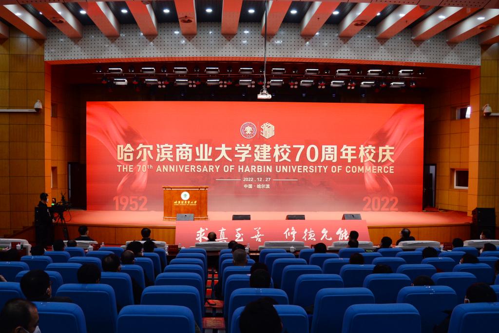 12月27日,雪后的校园银装素裹、玉树银花,到处洋溢着欢乐喜庆、隆重热烈的节日氛围。哈尔滨商业大学国际报告厅会场内外悬挂着“热烈庆祝哈尔滨商业大学建校70周年”“同庆七秩盛典 共谱商大新篇”的红色标语激荡人心,主席台前“求真至善 修德允能”的校训庄重夺目。大会现场播放《奋楫赶潮正当时——哈尔滨商业大学70周年校庆宣传片》,充分展现了哈商大辉煌的发展历程和办学成就;各地校友录制的祝福视频,表达了对母校的浓厚情感和真挚祝福。
