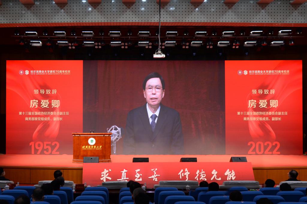第十三届全国政协经济委员会副主任,商务部原党组成员、副部长,我校1977级校友房爱卿通过视频致辞。房爱卿对哈尔滨商业大学建校70年来在办学层次提升、专业体系建设、人才培养质量、经济社会发展中所作出的重要贡献及所取得的成就表示肯定。房爱卿指出,随着经济、社会、科技的发展,现代流通业作用越来越大,现代流通越重要,哈尔滨商业大学前途越光明、道路越宽阔、前途越美好,但同时责任更重大、任务更艰巨。哈尔滨商业大学具有独特优势,既有传承70年的办学积淀,也有深厚的办学底蕴;既有逐步优化的学科基础,也有经验丰富的师资队伍。希望哈尔滨商业大学立足优势与特色,充分利用有利条件,更加深刻地把握现代流通发展规律和现代流通人才培养规律,全面落实立德树人根本任务,坚持科学的教学理念,坚持教育质量的生命线,培养更加适应经济社会发展需要的应用型、创新型、智慧型、复合型高端人才,充分发挥高等教育推进中国式现代化的支撑作用。