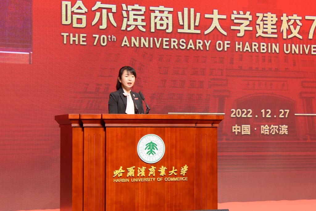 哈尔滨商业大学校长郑秋鹛讲话。郑秋鹛指出,回眸七秩,哈商大坚定不移走志怀祖国、人民为先的大商之道;坚定不移走立德树人、培根铸魂的大商之道;坚定不移走精益求精、追求卓越的大商之道;坚定不移走服务社会、至诚奉献的大商之道;坚定不移走诚信守正、厚德励行的大商之道。七秩涅槃离不开国家民族的繁荣富强和文明进步,离不开历久弥坚的文化根脉和精神密码,离不开与时俱进、解放思想和改革创新。七秩文脉绵延不绝,七秩逐梦奋楫争先,哈尔滨商业大学将立足新时代,锚定新坐标,开启新征程,以国立心,胸怀“两个大局”;以商弘业,矢志一流建设;以新求进,创新引领发展;以文铸魂,赓续中华文明。郑秋鹛表示,七十年沧桑砺洗的哈尔滨商业大学,优势渐显、影响日隆,此时此刻一幅美好的画卷正徐徐展开,这是擘画“商大梦”新征程的宏伟蓝图,是服务“六个龙江”建设的锦绣篇章,是助力科教兴国、人才强国、创新驱动发展战略的时代画卷,全体商大人将踔厉奋发、勇毅前行,为建成商科特色鲜明的、高水平的多科性教学研究型大学而努力奋斗。