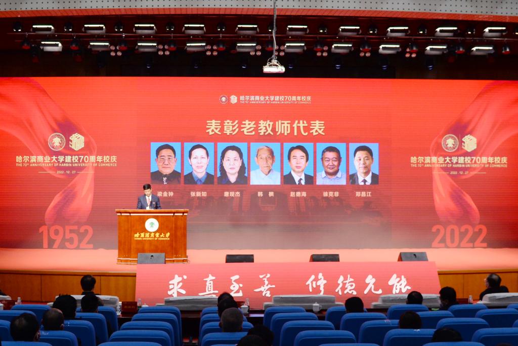 为感恩和铭记前辈们的特殊贡献,在建校70周年之际,学校特向工作在商大、服务在商大的著名市场营销学家、商科教育家韩枫教授,潜心于产业经济、商业经济、市场领域研究的赵德海教授,在技术创新及激励机制、公司治理与财务治理、国有资本与混合所有制改造领域多有建树的唐现杰教授,长期从事教学管理制度建设、本科专业人才培养、教学质量保障体系建设等方面工作的徐克非教授,著名货币史和钱币学专家张新知教授,致力于烹饪技术科学和酒店管理研究、烹饪教育教学及学科专业建设的郑昌江教授,著名微生物发酵工程专家梁金钟教授7位优秀老教师代表进行表彰。