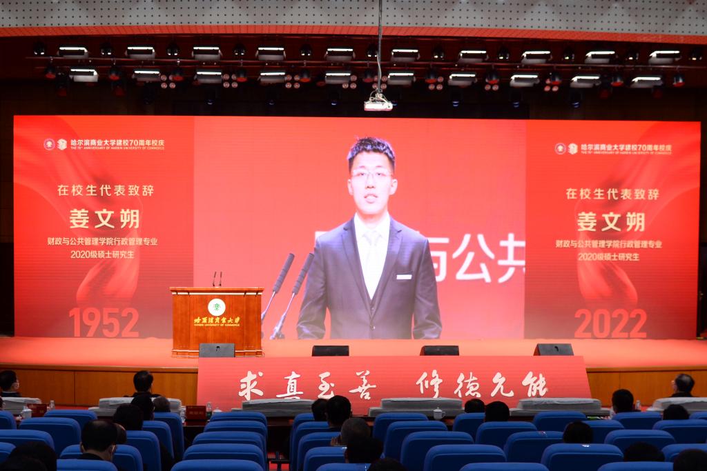 在校生代表、财政与公共管理学院行政管理专业2020级硕士研究生姜文朔发言。