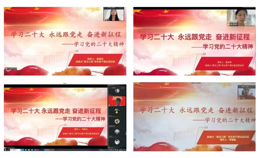 此外,宣讲团成员姜春玲、苗欣雨、李国玉、李鉴航分别在黑龙江省绥化市、黑河市、佳木斯市、齐齐哈尔讷河市等地,于线上开展宣讲活动。宣讲团成员以贴近群众、切近生活的宣讲视角,用生动活泼的语言,让党的二十大精神飞入“寻常百姓家”,以实际行动推动党的二十大精神在基层生根发芽。