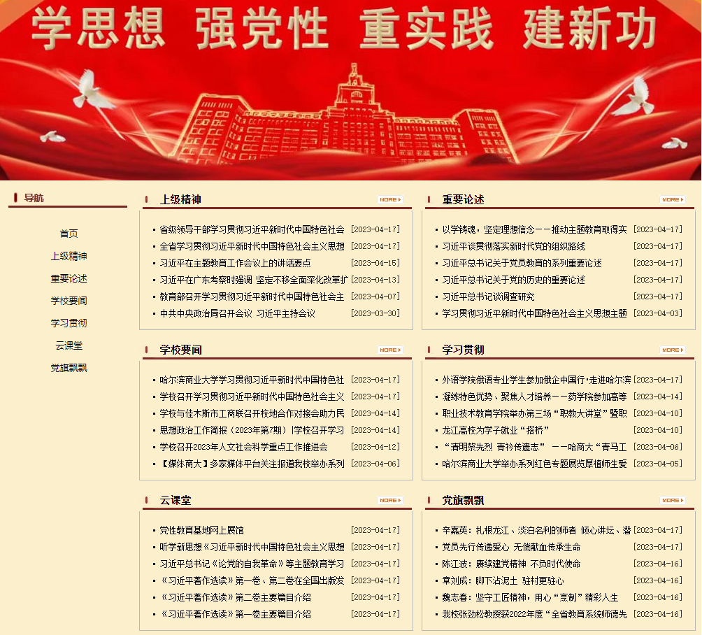 聚焦重要讲话,宣传重要论述,解读重要精神,展示先进事迹,报道学习动态,发出商大声音……为深入学习贯彻习近平新时代中国特色社会主义思想,全面系统掌握这一思想的基本观点、科学体系,把握好这一思想的世界观、方法论,坚持好、运用好贯穿其中的立场观点方法,不断增进对党的创新理论的政治认同、思想认同、理论认同、情感认同,真正把马克思主义看家本领学到手,自觉用习近平新时代中国特色社会主义思想指导各项工作,全面反映学校学习贯彻习近平新时代中国特色社会主义思想主题教育的生动实践,4月17日,由学校主题教育领导小组理论学习专项组策划推出的“哈尔滨商业大学学习贯彻习近平新时代中国特色社会主义思想主题教育专题网站”正式上线。全校师生可通过学校新闻网主页入口的专题网站链接进入。
