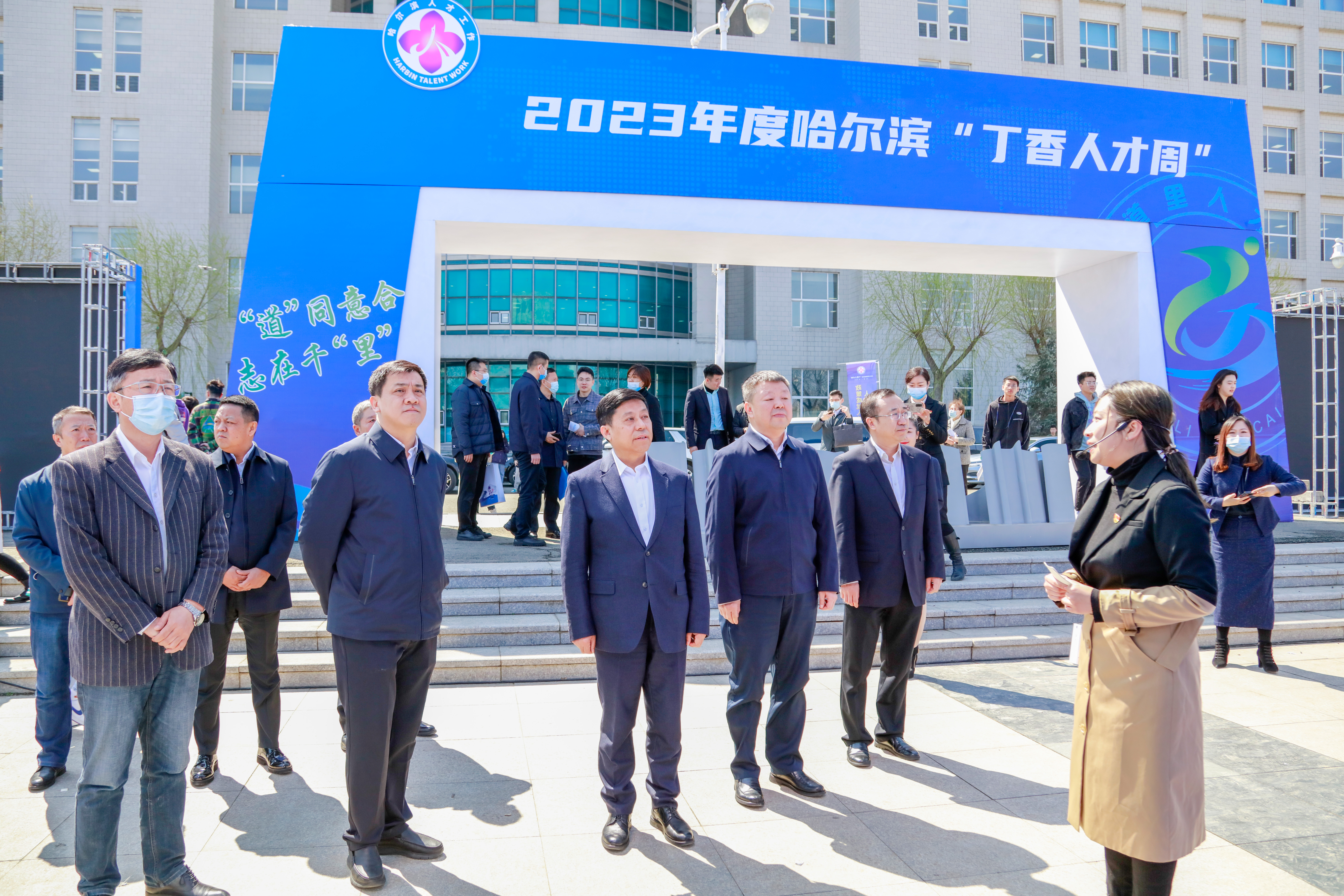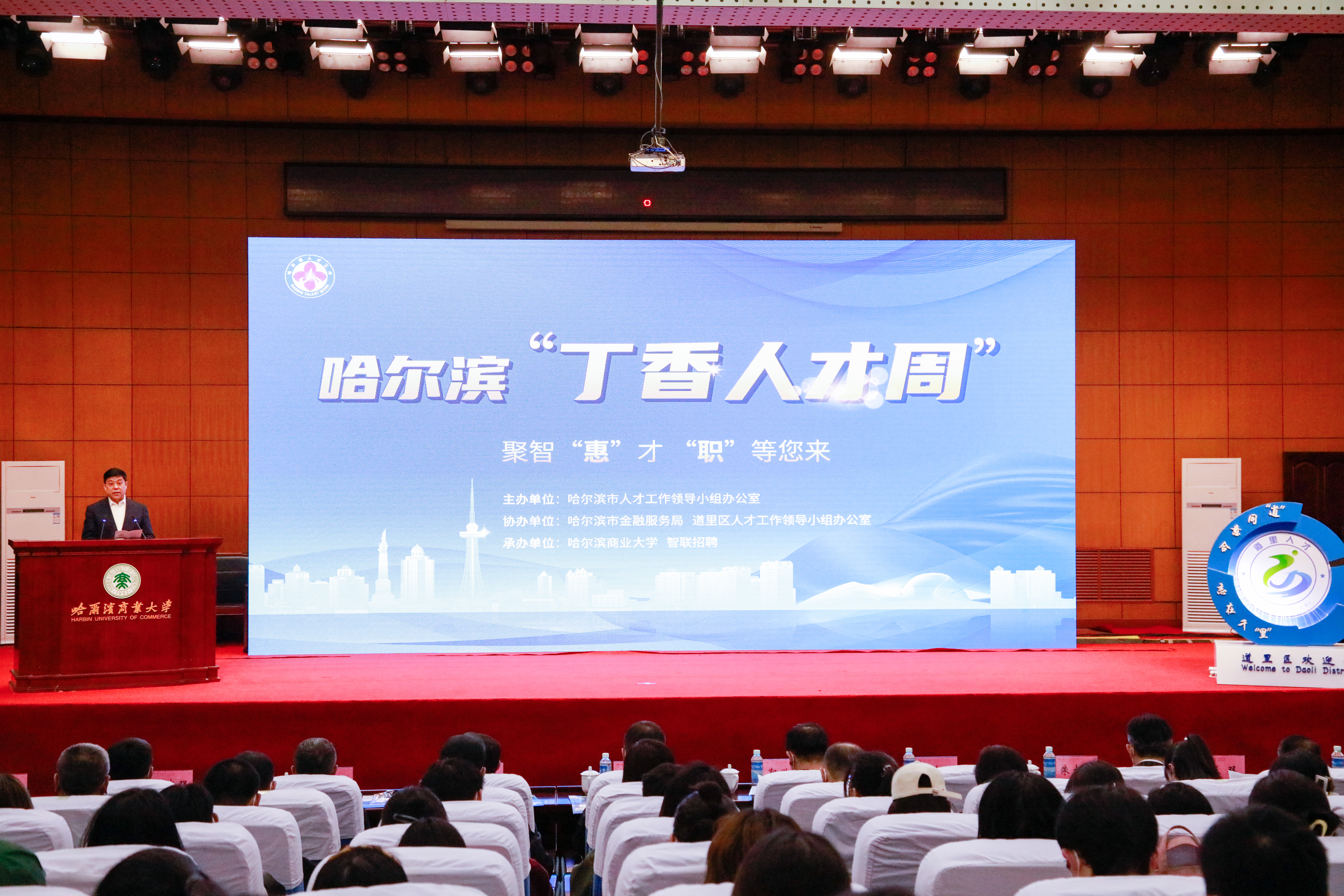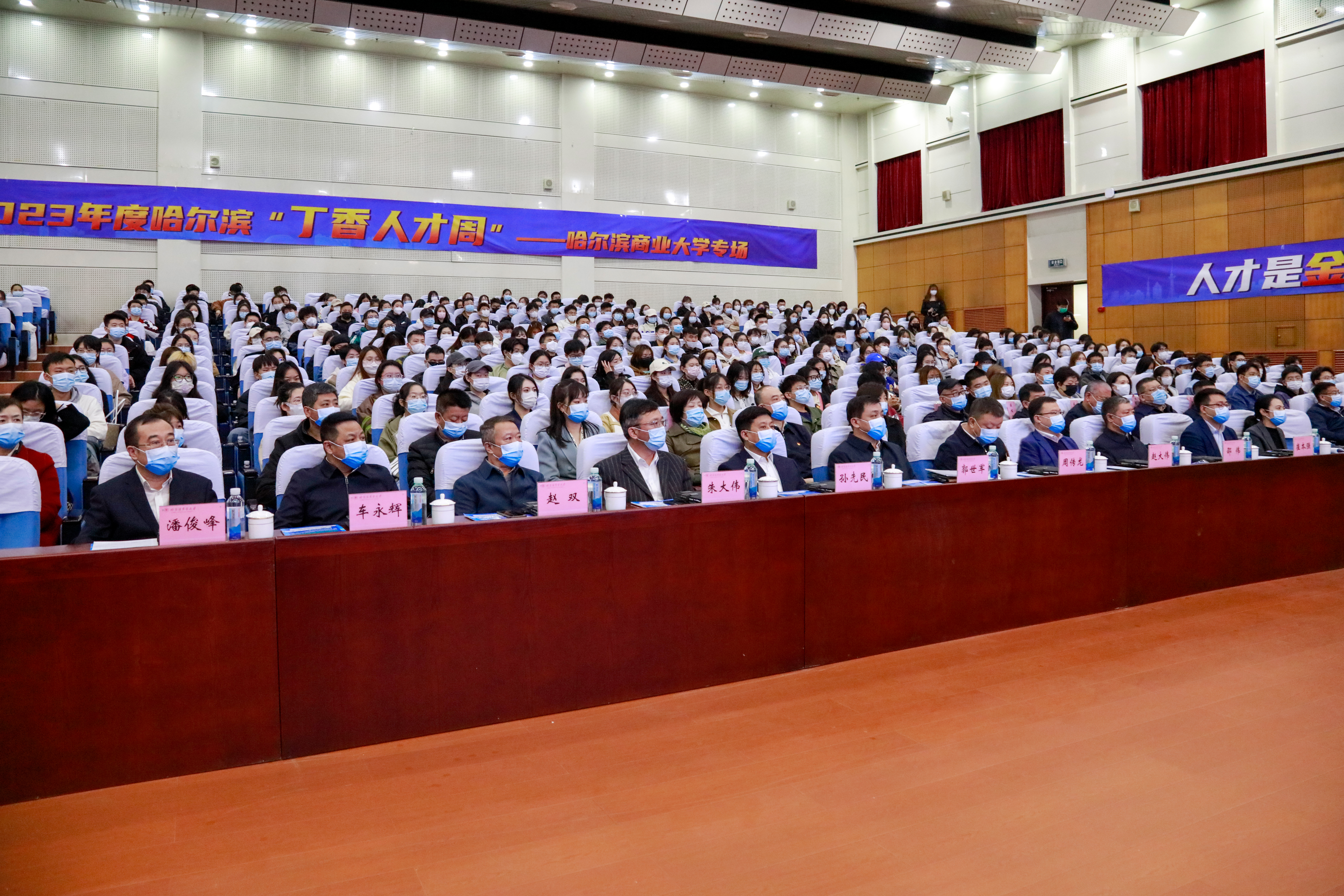 4月26日上午,由哈尔滨市人才工作领导小组办公室主办的“聚智‘惠’才 ‘职’等您来”——2023年度哈尔滨“丁香人才周”哈尔滨商业大学专场推介招聘活动在我校举办。哈尔滨市委组织部副部长、市委非公有制经济组织和社会组织工作委员会书记郭世军,哈尔滨市道里区委副书记、区长周传龙,哈尔滨市委组织部人才处处长朱大伟,哈尔滨市金融服务局副局长邵伟,哈尔滨市人力资源和社会保障局人力资源服务中心副主任赵双,道里区委常委、组织部部长车永辉;我校党委书记孙先民、副校长王巍、副校长赵大伟出席活动,学校相关职能部门负责人以及求职毕业生300余人参加活动。王巍主持活动。