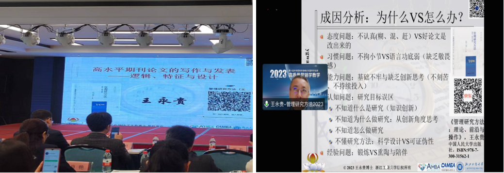 5月14日上午,中国高等院校市场学研究会副会长、国家杰出青年基金获得者、教育部长江学者特聘教授、“万人计划”哲学社会科学领军人才、2014—2022年高被引中国学者、浙江工商大学校长王永贵教授以《高水平营销期刊论文写作与发表——逻辑、特征与设计》为主题,从好的研究的标准、高水平期刊写作中的常见问题、高水平论文发表的主导逻辑、可发表期刊的共性特征等方面,介绍了写作与发表高水平期刊论文的态度、要求和方法,为广大营销学者如何进行高水平论文的选题、论证、写作和期刊投稿指明了方向。