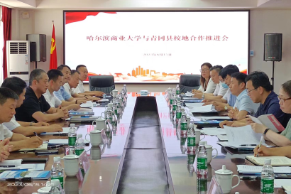 为大力推进学校科技成果产业化、推进校地合作落实落地,提升我校服务地方非公经济发展能力,6月15日下午,哈尔滨商业大学与青冈县校地合作推进会在我校行政楼三楼会议室举行。我校副校长李景义;青冈县县长孙国文、副县长马庆宝出席会议。青冈县政府办公室、商务局、农业农村局、市场监督管理局、优质企业代表,我校科研处、国有资产管理处、大学生就业创业指导中心、教务处、企业家学院、药学院、食品工程学院、轻工学院、设计艺术学院等相关单位领导参加会议。科研处处长邱泽国主持会议。