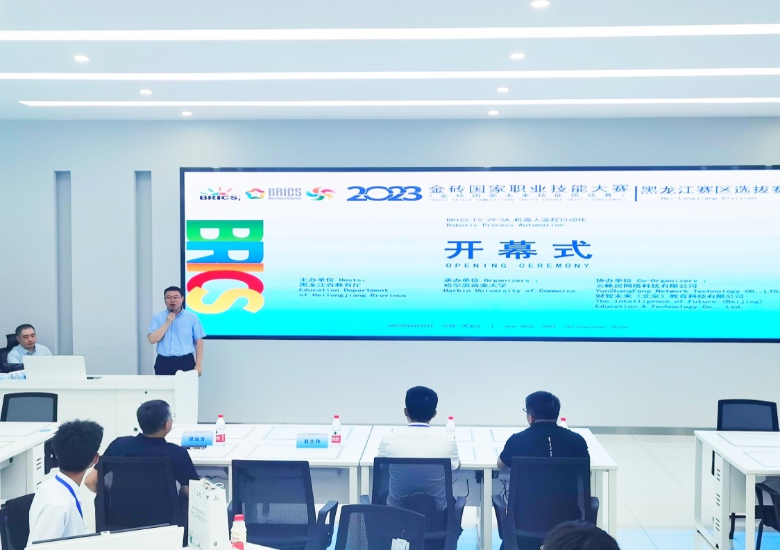 6月18日,2023金砖国家职业技能大赛机器人流程自动化赛项黑龙江省选拔赛在我校会计学院财务共享服务中心举办,哈尔滨商业大学副校长赵大伟教授,一带一路暨金砖国家技能发展国际联盟数智财经工作委员会秘书处秘书长赵珊,哈尔滨职业技术学院会计金融学院副院长李剑飞教授,哈尔滨商业大学会计学院副院长梁运吉教授,黑龙江省职业院校技能大赛金砖赛项组委会联络员、黑龙江农业工程职业学院曹克刚教授等领导和嘉宾出席开幕式。赵大伟教授为比赛开幕式致辞,浪潮会计学院执行院长刘阳教授主持开幕式。