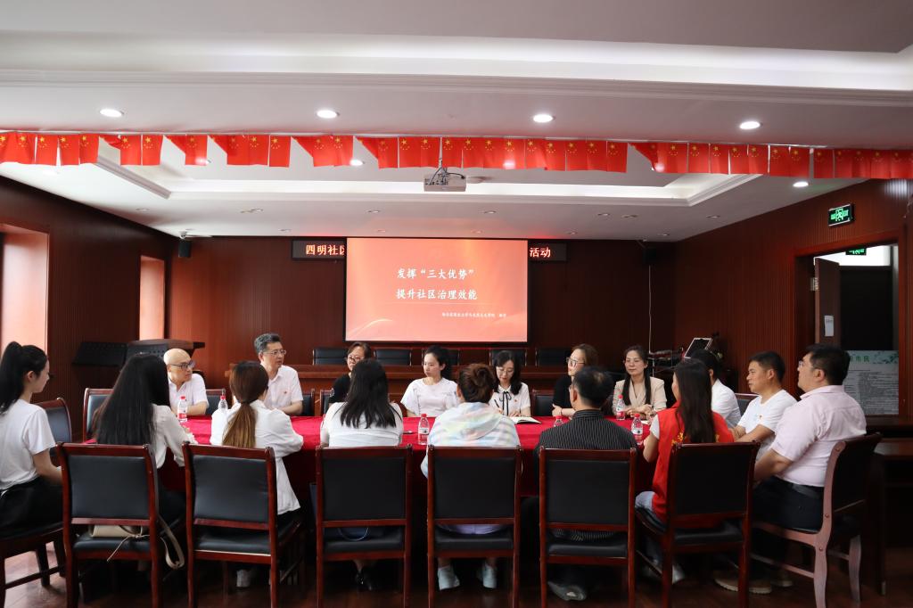 宣讲过后,党支部教师围绕“加强以民生为重点的社会建设”章节授课内容与社区工作人员进行探讨,社区主任罗丽华,干事陈乐、孙健、马骁、许婷进行了细致耐心的解答。学生代表针对大创项目中的问题向负责老年人工作的一线社区干部征求改进意见。党支部书记丁东宇、副书记周海涓分别介绍了马克思主义学院党委和教研室党支部情况。研讨现场互动踊跃、气氛热烈,四明社区老党员、志愿者、基层干部与学院教师、学生代表纷纷结合自身工作、学习实际,畅谈心得体会。